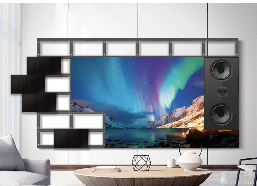 위 도표를 기준으로 본다면, 설치는 16:9 모듈 ⓐ/ⓑ를 기본으로 해서, 21:9로 확장하기 위한 모듈 ⓒ-1/ⓒ-2/ⓒ-3 3가지를 더해 총 6가지 형태로 구성해 보았다. 실제 상용화 시에는 줄어들 수도 있고, 달라 질수도 있겠지만, 다양한 형태로 제안하는 이유는, Micro LED TV의 특성을 살려, 용도에 맞게 화면을 구성해서 사용하기 위함이다. ⓐ+ⓒ-1> 2K(1920x1080)모듈 16개(4x4)+1280x1080용 모듈 8개(2x4)로 구성한 8KK(16:9)↔10K(21:9) Micro LED TV ==> 총 24개 모듈 사용