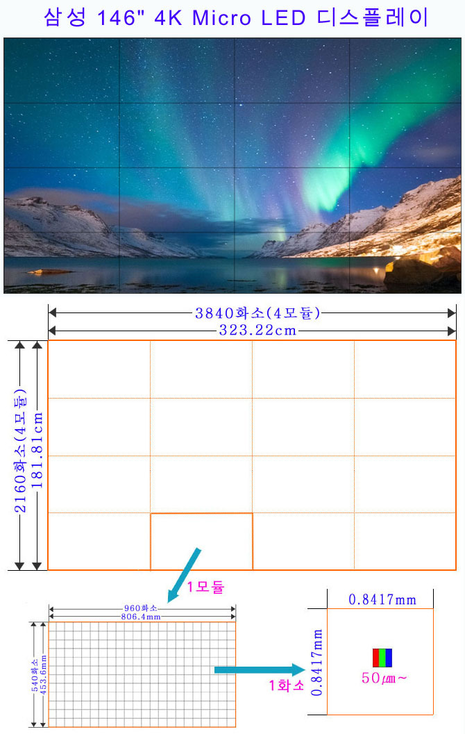 그럼 이번에 삼성이 공개한 110" 4K Micro LED TV는 어떻게 만든 것일까? 110" 4K TV의 1화소 크기는 0.6342mm(634.2㎛)다. 이 1화소 크기인 634.2㎛ 안에 5~100㎛크기의 Micro LED(R/G/B) 소자를 넣어서 배열하면, 110" 4K Micro LED TV를 만들수 있는 것이다. 그렇다면 110" 8K Micro LED TV는 어떨까? 110" 8K Micro LED TV는, 1화소 크기가 0.3171mm(317.1㎛)이므로, 317.1㎛안에 5~100㎛크기의 Micro LED소자를 넣어서, 110" 8K Micro LED TV를 만들면 된다. 이론적으로 보면 아주 간단해 보이지만, 머리카락보다 작은 R/G/B 3색의 Micro LED소자를 634.2(4K)~317.1(8K) ㎛(마이크로)안에 이식을 해야 하는데, 4K의 경우 24,883,200개의 소자를 심어야 하고, 8K라면 무려 99,532,800(약 1억)개의 소자를 심어야 한다, 해서 아직은 110" 4K Micro LED TV를 한 달에 10여대 정도밖에 생산을 못해 가격이 비싼 것이다. 하지만, 이러한 공정을 개선해서, 가격만 낮출 수 있다면, Micro LED는 소형 HMDI(VR)용 디스플레이부터 스마트폰, 중형 모니터, 그리고 100" 내외의 디스플레이(TV)까지 만들 수 있다. 또한 요즘 관심을 끌고 있는 플랙시블은 물론 투명 디스플레이까지도 가능하여, 거의 모든 디스플레이에 적용할 수 있다. 그리고 무엇보다 화질이 그 어떤 디스플레이보다 우수하여, 자연스런 디스플레이라는 점에서, 미래 디스플레이의 확실한 주자가 되고 있는 것이다. 해서 TV마니아로서 Micro LED TV에 매료될 수밖에 없는 것이다. 하지만, 운영자가 Micro LED TV에 갖는 또 다른 매력은, 변화되고 있는 TV트랜드(대형화/다양성)에 가장 이상적으로 대응을 할 수 있다라는 것이다. 현재 TV시장은 사실상 LCD(LED)와 OLED밖에 없다. 이들 LCD(LED)와 OLED는 모두 RGB컬러필터로 색상을 구현하다보니, 다가오는 8K/120fps, 12bit영상을 온전히 담아내기엔 부족함이 있다. 특히 8K 영상의 화질을 온전하게 느끼기 위해선, 8K TV 화면이 120"내외는 되어야 한다는 점을 감안하면, 이에 적합한 TV는 Micro LED TV밖에 없다라는 것이다. 물론 현재 창홍이나 샤프는 110"/120" 8K LCD(LED) TV를 출시하고 있다. 하지만, 가격은 논외로 하더라도, 세트로 된 110"/120" TV를, 아파트와 같은 엘리베이터로 옮기는(이동) 자체가 쉽지 않기 때문에, 현실적이지 못하다. 그리고 무엇보다 가정에서 100"~ 대화면을 설치한다면, 영화 감상 비중도 무시할 수는 없다. 헌데, 방송(16:9)과 영화(21:9)의 화면비가 맞지 않아, TV(16:9)로 영화를 보면, 화면 위아래가 검정화면으로 나와 하면 로스가 생긴다. 이러한 낭비적인 화면비 문제를 해소할 수 있는 유일한 방법은, 바로 Micro LED TV밖에 없다. 즉, 모듈로 된 Micro LED TV는, 8K TV(16:9)로 방송시청을 하다가, 영화를 감상한다면, 10K TV(21:9)로 화면을 변환해서 보면 된다. 다시 말해 TV를 8K↔10K로 변환이 가능한 게 바로 Micro LED TV다.