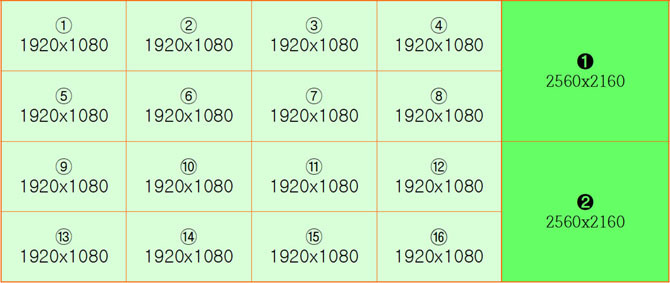ⓐ+ⓒ-3> 2K(1920x1080)모듈 16개(4x4)+2560x2160용 모듈 2개(1x2)로 구성한 8K(16:9)↔10K(21:9) Micro LED TV ==> 총 18개 모듈 사용 ☞화면(모듈) 구성