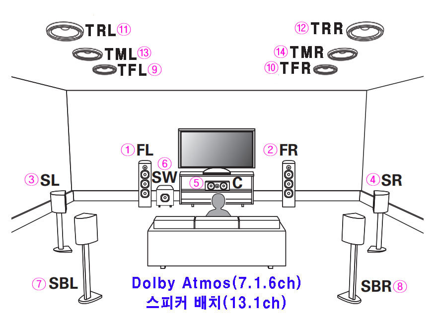 13.1 (7.1.6) | 위 중앙 2ch | ⑬Top Middle Left | TML | 위(천정) 중앙 왼쪽 | |