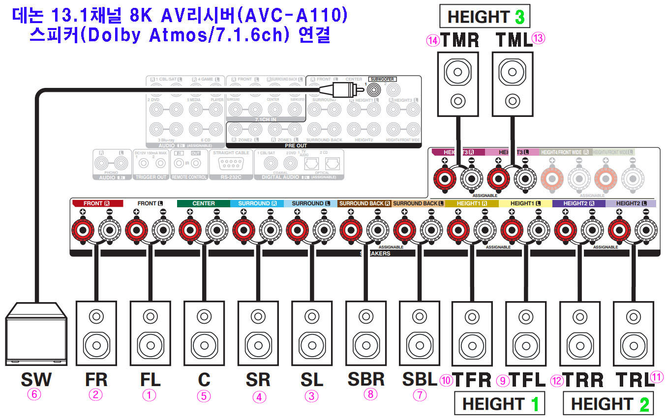 스피커 연결은, 보편적 수준에서, 현재 최고 채널인 13.1(7.1.6)채널을 예로 들었다.