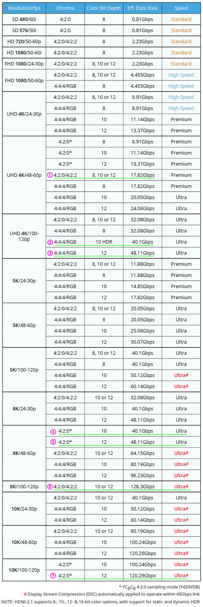 HDMI에 대한 사양(기준)을 정하고, 관리(인증) 하고 있는 "HDMI Forum"은, 2017년 11월에 HDMI 2.1에 대한 사양을 공개하면서, HDMI 전송량에 대해서도 공개를 하였다(아래 이미지 도표).