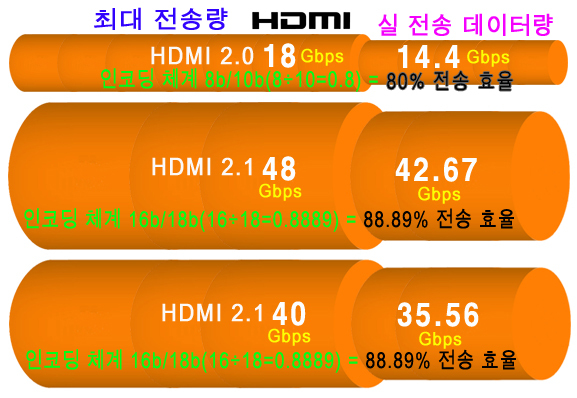 헌데, 문제는 48Gbps 전송량을 갖는 HDMI 2.1의 실제 전송 가능한 데이터량은 42.67Gbps다. 또한 40Gbps의 전송량을 갖는 HDMI 2.1의 경우는, 실제 데이터 전송량은 35.56Gbps다. 이는 HDMI 2.1이 인코딩 체계를 ‘16b/18b’를 사용하기 때문이다. 즉, 16bit 입력 신호를 18bit 코드로 변환하는 인코딩 체계를 사용하여, 전송 효율이 88.89%(16÷18=0.8889) 나오기 때문이다.