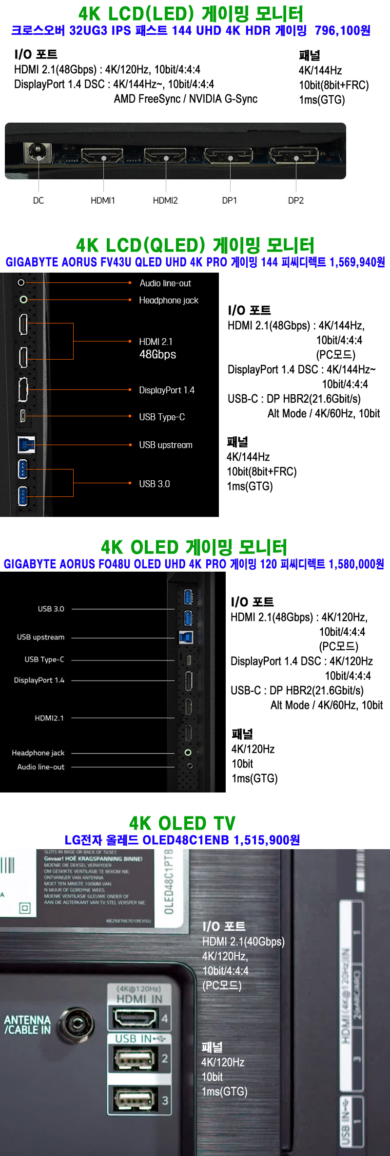 해서 게이밍 모니터는 30인치 내외가 적절하다. 다만, HDMI 2.1과 DisplayPort 1.4 DSC를 지원하는 4K LCD(LED) 모니터가 32인치 기준 80만원이상 하여 저렴하지만은 않다. 하지만, 160만원하는 48인치 4K OLED 모니터/TV보다는 비록 사이즈는 작지만, 가격이 절반이고, 게임에 최적화 되었다는 점에서, 현재로선 4K LCD(LED) 모니터가 게임에 가장 최적화 되었다고 할 것이다.