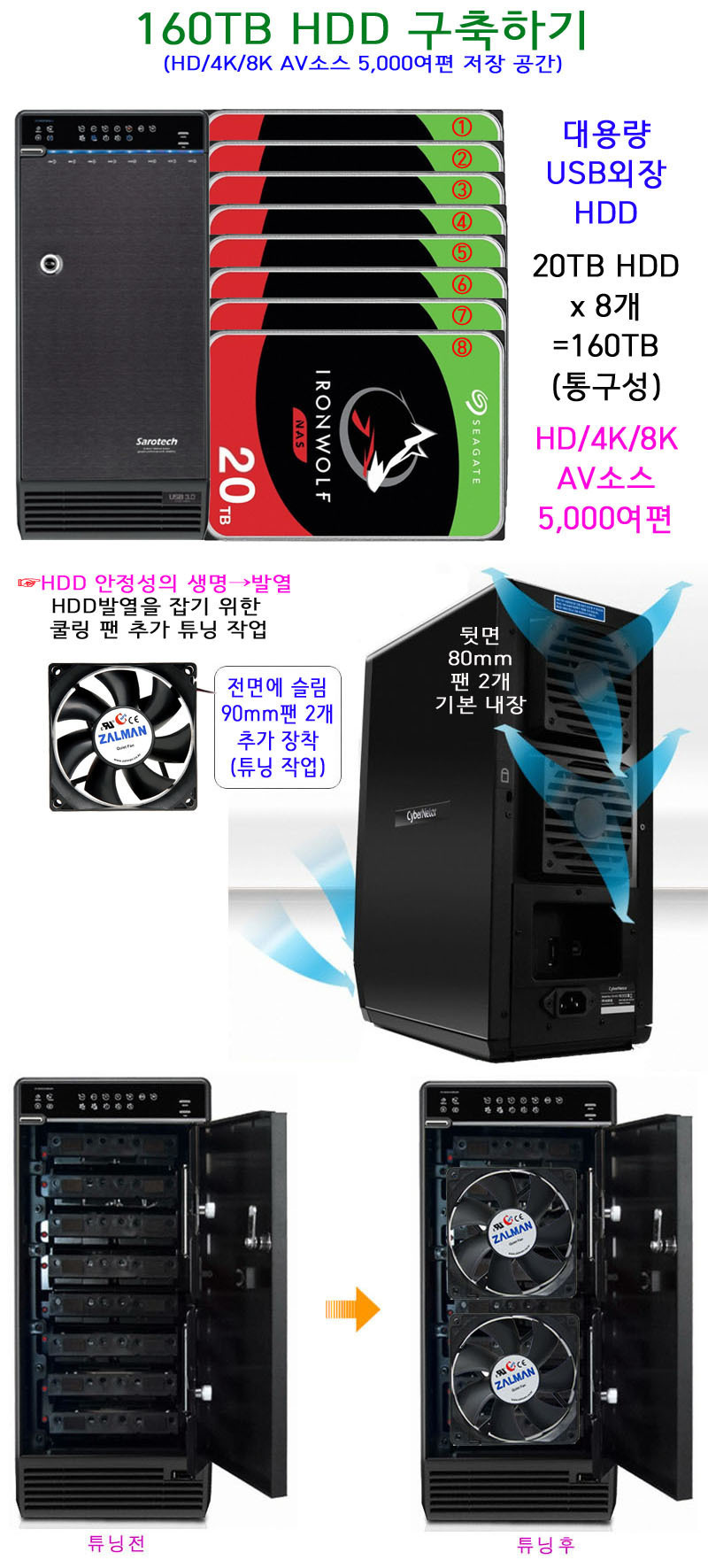 | ▶HDD 사용 시 주의 점 IT제품 고장의 원이 1순위는 발열이다. 특히 HDD를 1~2시간 이상 연속해서 사용하거나, RAID로 묶어서 여러 개의 HDD를 동시에 사용하눈 경우, HDD의 발열은 배가 된다. 해서 냉각팬으로 발열만 잡아준다면, HDD가 물리적으로 고장 날 확률은 거의 “0”에 가깝다. 그리고 부가적으로 HDD는, 운영의 묘가 있어야 한다. 우선 HDD를 놓은 위치는 진동이 없는 바닥이 좋다. 그리고 무엇보다 HDD주변은 통풍이 잘 되어야 한다. 그리고 HDD가 읽거나 쓰고 있을 때는 절대로 HDD의 전원을 꺼서는 안 된다. 아울러 정전이 잦은 곳이라면, UPS를 하나 설치하는 것이 좋다. ▶HDD를 이용한 AV감상 블루레이 영상을 원본 그대로 HDD에 저장(리핑)하면, 영화 한편에 25GB(HD급)~80GB(4K급) 정도 된다. 헤서 1,000편 이상의 영화를 HDD에 담아 사용하려면, 10~20TB HDD 5~10개를 RAID로 묶어서 사용하면, 많은 영화를 장르별로 분류 저장해서 감상을 하면, 쉽고 편리하게 찾아서 AV를 감상할 수 있다. 특히 화질의 척도가 되는 압축(전송) 비트레이트가 방송의 경우 4K에 60fps, 16~25Mbps 정도이고, OTT의 경우는 4K에 24~30fps, 16Mbps내외지만, 4K 블루레이는 4K에 24~30fps, 50~80Mbps 정도로 화질에서 압도적 우위를 보여 주는 것은 물론, 서라운드 음향에서도 압도적으로 우수함을 보여준다. 헤서 진정한 AV감성은, 블루레이 디스크로 감상할 것을 권한다. 그것이 아니라면, 블루레이 영상을 원본 그대로 HDD에 저장(리핑)해서 감상할 것을 권한다. 참고로 최근 SSD가격이 많이 내려 일부 분들이 HDD대신 SSD로 구축하면 좋겠다는 분들이 계시지만, 현실은 30TB이상만 되어도 가격적으로 SSD는 대용량 구축엔 한계가 있다. 'SSD Vs HDD'간 경쟁력을 참고로 비교해 보았다. |
