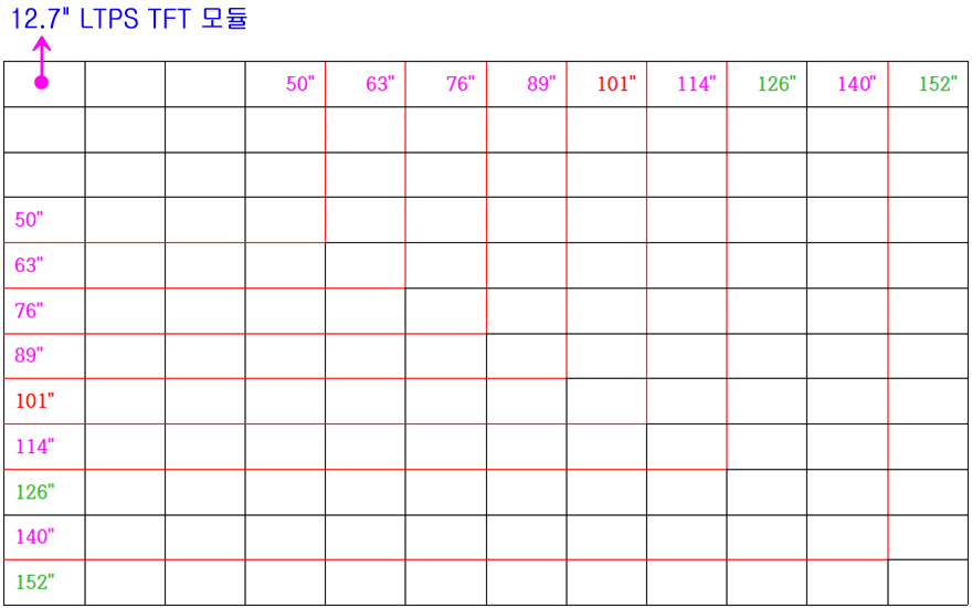 | 8K TV | 77"/88" | X | X 50"/63"/76"를 4(2x2)배 조합하면, 100"/126"/152" 8K TV 가능 |