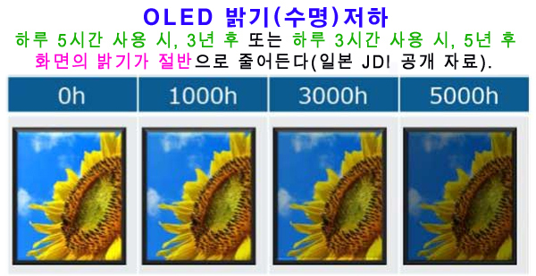 | ※OLED의 장점은, 처음 구입 시, LCD보다 다소 화질이 좋다는 것 외에는 없다. 하지만, 2~3년만 지나도 OLED의 내구성(번인현상/밝기저하)이 급격히 저하가 되어, 비싼 가격에 비해 내구성은 LCD TV보다 한참 쳐진다. 특히 OLED소자 자체가 유기물이라, 버닝 문제와 밝기저하 문제를 원천적으로 해소하기 힘들기 때문에, OLED를 TV용으로 사용하는 것은 적절치 않다. |