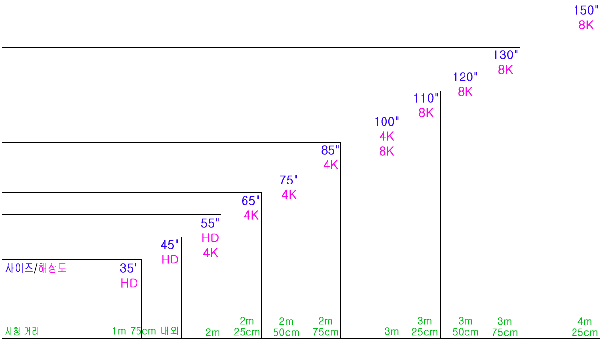 | 권장 크기 | 35" | 45" | 55" | 65" | 75" | 85" | 97"~ 100" | 110" | 120" | 130" | 150" |