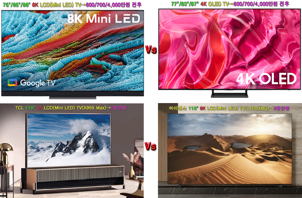 | ▶75"이상 대형 TV를 추천하는 이유 최신의 TV하면, QLED(Mini LED) TV나 OLED TV를 대표적으로 내세우고 있지만, TV마니아로서 30년 넘게 카페를 운영하다보니, 요즘처럼 TV를 만드는 기술이 평준화 되고, 또한 TV가 사실상 4K TV로 10년째 정체가 되면서 느낀 것은, TV는 화면이 큰 것이 제일 좋다. 물론 그동안 빔 프로젝터가 있었지만, 프로젝터가 어두워야만 볼 수 있다는 측면에서, 전용 룸(어둡게)을 사용하지 않는 이상 가정용 TV(장시간 시청/자주 끄고 키는)로는 그리 적합하지 않다는 점에서 일반 TV와는 거리가 멀다. 특히 우리가 UHDTV로 볼 수 있는 콘텐츠의 90%는 아직도 HD이고, 10%내외의 UHD(4K)콘텐츠 질은 10bit/4:2:0에 16Mbps로 무늬만 UHD(4K) 화질이다. 여기에 8K UHD콘텐츠는 전무한 실정이다. 즉, 지금과 같은 콘텐츠 환경이라면, QLED(Mini LED) TV, OLED TV, 8K TV와 같은 '프리미엄TV'는 사실상 의미가 없다. 또한 100인치 미만에선 4K TV와 8K TV간 화질 차이를 느끼기도 힘들기 때문에, 100인치 미만으로 상용화되고 있는 8K LCD(Mini LED) TV나 8K OLED TV는 더 더욱 의미가 없다. 하지만, 4K OLED TV와 8K LCD(Mini LED) TV의 가격이 비슷해지면서, 4K OLED TV를 구입을 고려하시는 분들은 다시금 고민해 보시는게 어떨까 한다. 특히 수백만원이상 하는 75인치 이상 TV라면 더 더욱 고민을 해봐야 하지 않을까 싶다. 즉, 77"/83"/97" 4K OLED TV 가격이면, 75"/85"/98" 8K LCD(Mini LED) TV를 구입할 수 있기 때문이다. 아무리 4K OLED TV 화질이 좋다고 해도 8K 화질은 구현하지 못하기 때문에, 비록 LCD(Mini LED) TV라 해도 8K TV와 4K TV는 급이 다르기 때문이다. 그런 점에서 크기가 비슷한 같은 LCD(Mini LED) TV가 있다면, 8K TV를 권한다. 즉, TCL 115" 4K LCD(Mini LED) TV(X955 Max) 가격이 2천만원인데 반해, 하이센스가 9월에 출시할 예정인 110" 8K LCD(Mini LED) TV(110UXNQ)가 3천만원이면 구입이 가능할 것으로 보이기 때문에, 선택은 분명해진다(아래 도표 참조). |