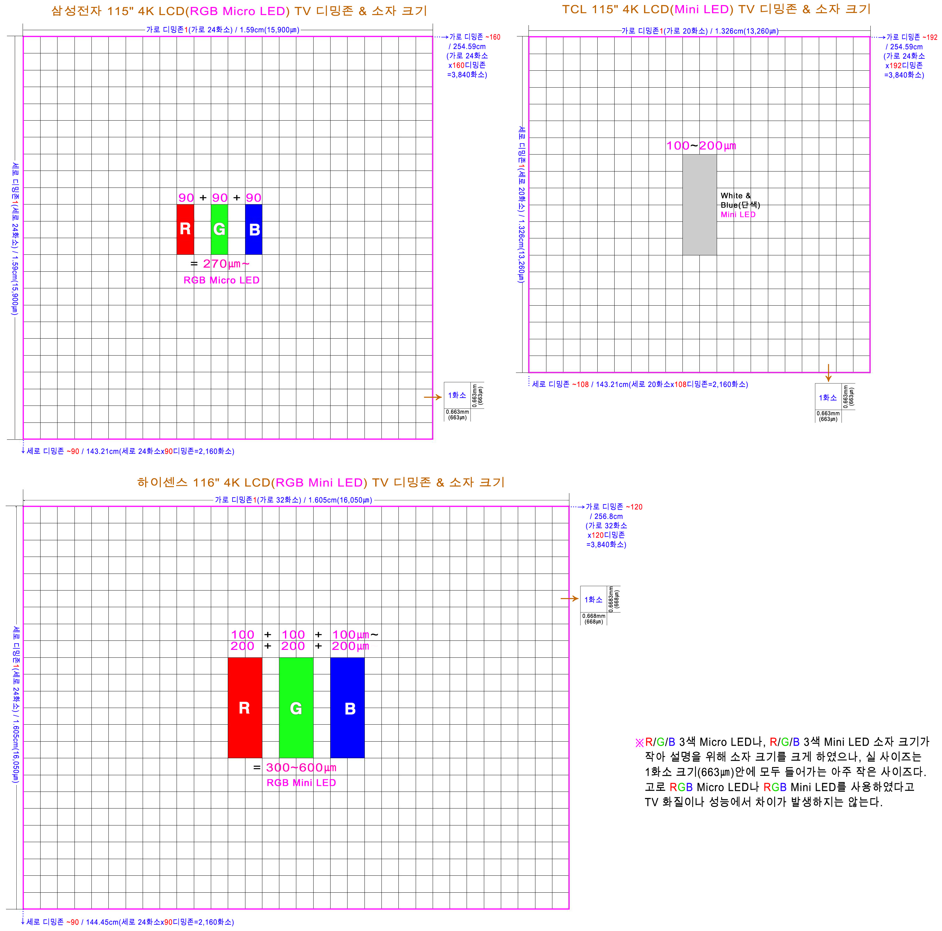 | 하이센스 116" 4K RGB Mini LED TV | 256.8cm x144.45cm | 1.605cm x1.605cm | *개별크기 :100~200㎛ *R/G/B 3색 크기:300 ~600㎛ | 10,800개 (120X90) | 32화소 X24화소 =768화소 ※1화소 크기 가로x세로 0.669mm (669㎛) | 디밍존 10,800개x 3색 Mini LED =32,400 |