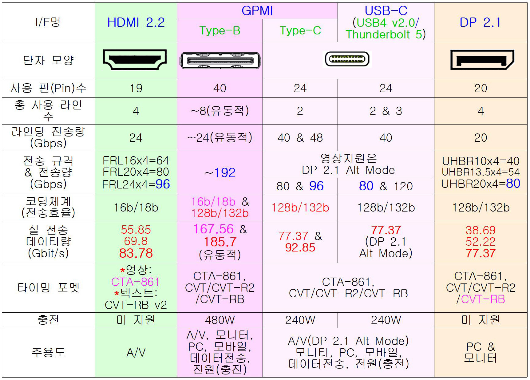 ▶HDMI 2.2 Vs GPMI Type-B/C Vs USB-C(USB4 v2.0/Thunderbolt 5) Vs DP 2.1 성능 비교