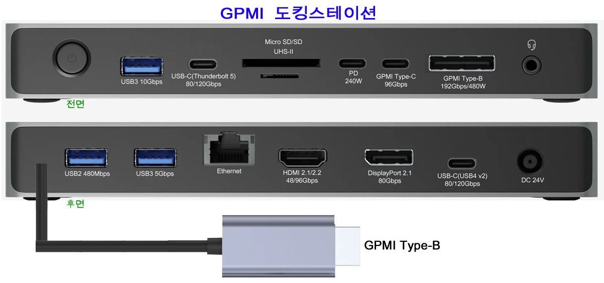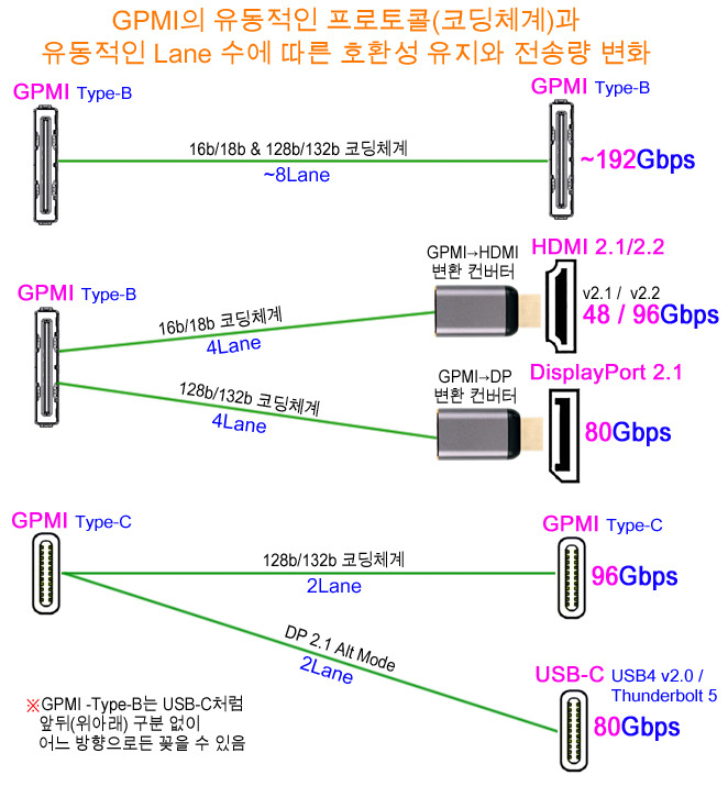 | ※GPMI Type-B는, 전송 프로토콜(코딩체계)를 128b/132b 또는 16b/18b를 사용할 수 있고, Lane수도 4~8Lane까지 유동적으로 사용하여 HDMI나 DP와도 동일한 성능(전송량)으로 호환할 수 있고, GPMI Type-B와 GPMI Type-B로 연동 시에는 최대 192Gbps의 전송량을 낼 수 있다. ※GPMI Type-B는, 케이블 컨넥터 방향이 USB-C처럼 방향성이 없어, 케이블 꼽기가 편리하다. | |||||
