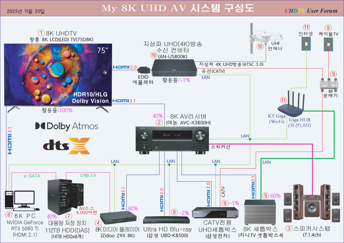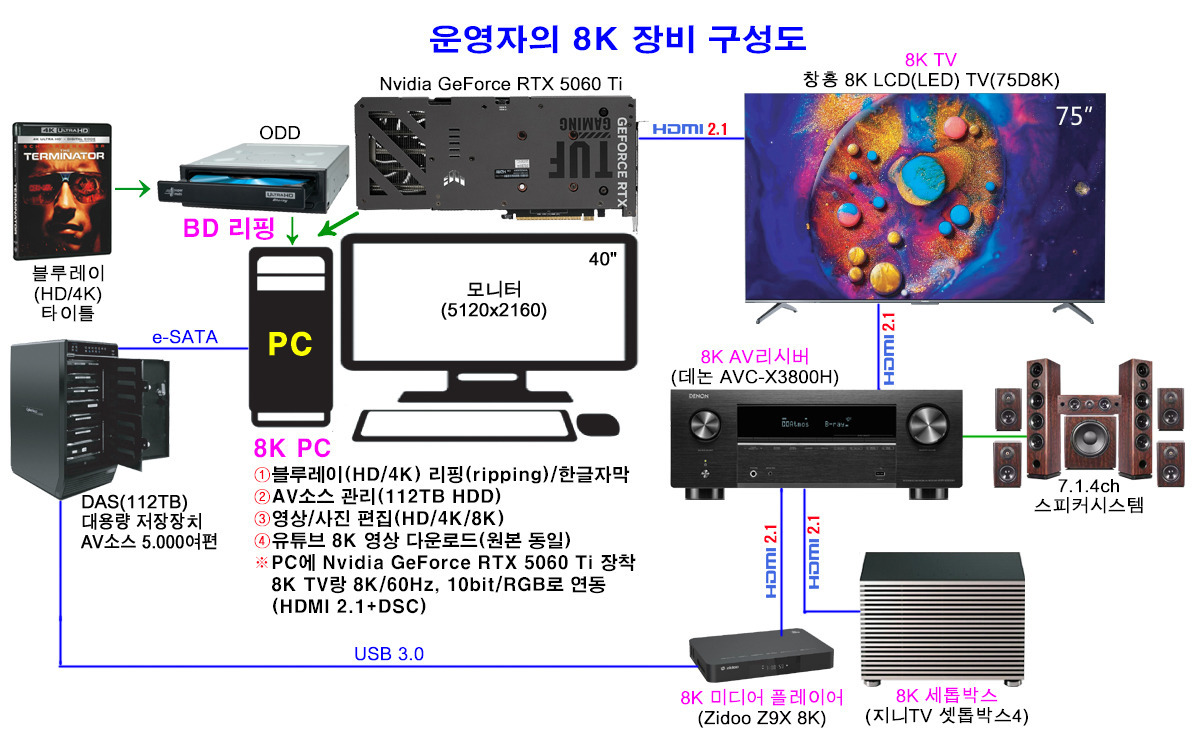 | ①8K UHDTV(창홍, 75" 8K LCD(LED) TV/D8K시리즈) 2020년 6월, 중국 창홍(CHANGHONG) 75" 8K LCD(LED) TV(D8K시리즈)를 직구로 구입(부대비용 포함 총 260여만원) 하였다. 5년 6개월째 사용하고 있으며, 성능은 최신 8K TV에 비해 뒤쳐지지 않고 있고, 화질도 나름 만족하며 시청하고 있다. 특히 리모컨의 편리성과 HDMI 2.1의 성능은 만족스럽다. ②8K AV리시버(데논 AVC-X3800H)+③스피커시스템(7.1.4ch) 2024년 3월에 150여만원을 주고 구입하였다. 음질은 마음에 들지만, PC와의 연동 시 HDMI 2.1의 성능에 부족함이 있다. 이는 다른 8K AV리시버도 마찬가지이기 때문에, 달리 방법이 없다. 해서 PC는 창홍 8K TV랑 직접 연동해서 사용하고 있다. 8K AV리시버의 필요성은, HD부터 8K/60Hz, 10bit/4:2:0까지의 영상(HDR포함)과 함께 UHD오디오(Dolby Atmos/DTS:X)를 패스쓰루(Pass Through)로 함께 감상하기 위해서다. 데논 AVC-X3800H는 그리 고급형은 아니지만, 거실에서 홈시어터(서라운드)용으로 사용하기에 크게 부족하진 않다. 서라운드용 스피커는, 2010년 HD AV시스템을 구축할 당시 폴크오디오 TSi Series를 5.1ch로 구축할 때 구입하여, 이후에 2.4ch을 업 하였다. 좌우 프론트용 TSi400(2조), 좌우(전후) 리어 TSi100(4조), 센터 CS10(1조), 우퍼 PSW 10(1조), 천정용 온교 SKH-410(4조) 스피커로 7.1.4ch로 구축하여 서라운드 음향을 사용 중에 있다. 이는 객체기반 오디오(Dolby Atmos/DTS:X)를 가장 효율적으로 구현할 수 있는 구성이다. 물론 거실에 설치해서 온전한 서라운드 효과를 느끼기엔 다소 부족함이 있어, 마음 같아선 당장이라도 전용 룸을 구축하여, 실감나는 7.1.4ch 서라운드 음향을 청취하고 싶지만, 집에 따로 전용룸을 만들 여력이 되지 않다보니, 전용룸은 2~3년 후, 전원주택에 구축해서 150인치 21:9 Micro LED TV와 함께 기대를 해야 할 것 같다. ④8K 미디어플레이어(Zidoo Z9X 8K)+⑦대용량 저장 장치(112TB HDD→HD/UHD소스 5,000여편) Zidoo Z9X 8K 미디어플레이어를 데논 8K AV리시버(AVC-X3800H)로 연동하면, 음향은 주로 UHD오디오(Dolby Atmos/DTS:X)를 패스쓰루(Pass Through)로 청취를 하고, 영상은 HDR과 함께 창홍 8K TV로 감상을 한다. 이때 8K 미디어플레이어로 주로 감상하는 콘텐츠는, 정품 블루레이(HD/4K) 타이틀을 원본 그대로 리핑한 소스(폴더/ISO)를 감상한다. 정품 블루레이 타이틀을 원본 그대로 리핑한 소스는 112TB HDD(DAS 시스템)에 담아서 보관 감상을 한다. DAS 시스템은, 새로텍 CyberNetor Super RAID System(C8-US3)을 당시 50만원대에 구입하여, 14TB HDD 8개를 통으로 구성하여, 112TB 용량을 하나의 HDD처럼 묶어서 사용하고 있다. 이처럼 여러 개의 HDD를 묶어서 사용하다보니, 내장 된 쿨링팬으로는 발열을 온전히 잡아주지 못해, 120mm 슬림 쿨링팬을 전면에 2개를 부착하여, 발열을 잡아 줌으로서, 30도가 넘는 한 여름에도 하루 종일 AV를 감상해도 HDD는 미지근한 상태를 유지하여, HDD 발열을 완벽하게 해소함으로서, 대용량 HDD 사용에 따른 데이터 유실 걱정을 해소하였다. 이렇게 대용량의 HDD에 리핑한 소스를, 'HD-4K-8K', 그리고 '국내-해외'로 나누어 '장르별-시리즈별'로 폴더를 만들면, 8K 미디어 플레이어로 USB로 연동해서 AV를 감상한다. 이처럼 리핑(폴더/ISO) 소스로 감상하는 AV는, 정품 블루레이 타이틀로 감상하는 것과 동일한 화질-음질을 구현해 준다. 사실 "8K 미디어 플레이어+112TB HDD"로 감상하는 것이, 블루레이 플레이어로 감상하는 것보다 더 편리하다. 정품의 경우 디스크를 일일이 넣었다 뻈다를 해야 하는데, 그런 걸 하지 않아도 되고, 수천편의 AV소스를 원본과 동일하게 리모컨 하나로 손쉽게 골라 볼 수 있기 때문이다. 그런 의미에서 Zidoo Z9X 8K 미디어플레이어는, 다양한 동영상을 원본과 동일하게 감상하기에 가장 최적화된 플레이어라고 할 수 있다. 해서 이러한 감상은, 최적의 감상법이긴 하지만, 문제는 새로이 시작하는 분들이 리핑(폴더/ISO) 소스를 구하는 것이 쉽지 않다는 점이다. 물론 인터넷을 통해 다운로드하는 방법이 있지만, 최근엔 리핑 소스가 원본 그대로 리핑되지 않은 것들이 대다수여서 화질-음질을 보장하기 힘들다. 해서 운영자처럼 AV를 즐긴다면, 어떤 형태로든 원본 그대로 리핑한 소스를 구할 방법을 먼저 찾는 것이 중요하다. 그리고 112TB HDD를 구축하는 비용도 다소 부담이 될 수 있다. 적어도 5백만원 내외는 들어야 하기 때문에, 어지간한 결심과 예산 없이는 도전하기 힘든게 사실이다. 하지만, 자신이 조금만 노력한다면, 리핑 소스를 구하는 것도 가능하고, 112TB HDD 구축 비용도 온전한 AV감상을 위해선 감내할 수밖에 없다. 사실 운영자가 구축해서 사용하는 AV장비들을 모두 합쳐도 고급 Hi-Fi용 스피커 하나 가격도 안 된다. 운영자의 AV장비들은 중저가에 해당이 되지만, 8K에 최적화해서 구축을 하였고, 또한 그에 걸 맞는 콘텐츠로 AV를 감상하기 때문에, 가장 온전하게 8K AV를 감상할 수 있다. 그런 점에서 요즘 많은 분들이 AV에 대해 관심을 갖지만, 편리하다는 이유로 콘텐츠는 대다수 OTT를 이용하고, 사운드는 사운드 바로 청취를 하는 경우가 대다수이다보니 많은 아쉬움이 남는다. 해서 전용 룸까지는 아니지만, 거실이라도 AV리시버+7.1.4ch의 스피커를 설치해서 감상해 볼 것을 권해본다. 
