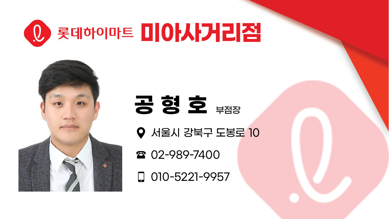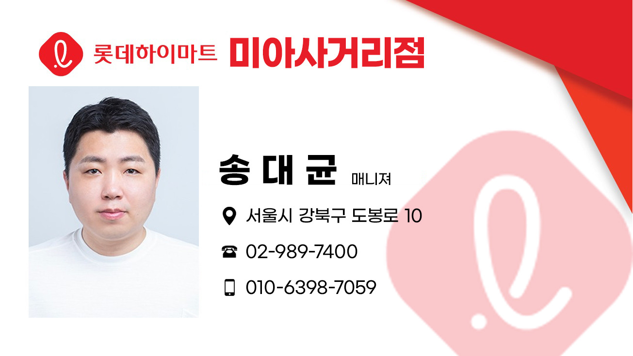 | 하이마트 미아사거리점(서울)에 근무하시는 카페 회원 분께서 좋은 혜택으로 삼성·LG전자 83"/77" 4K OLED TV를 판매한다고 하여, 소개해 봅니다. 이 혜택은 하이마트 미아사거리점 단독으로 진행하기 때문에, 다른 하이마트 지점이나 삼성·LG전자 대리점에선 구입할 수 없다고 합니다. 구입은 아래 제품별 각각 15대 한정해서 판매를 하기 때문에(매장 판매 포함), 조기에 소진이 될 수 있다고 하니, 관심 있으신 분들은 서둘러 신청해 주시기 바랍니다. 맨 이래 첨부한 명함에 있는 직원분과 휴대폰으로 연락를 하시거나 플러스친구를 통해 비대면 상담·구입이 가능하다고 합니다. 카카오톡채널 - 롯데하이마트 미아사거리점 -> 클릭하셔서 문의 주셔도 됩니다. 링크 (https://pf.kakao.com/_cyExexl) |