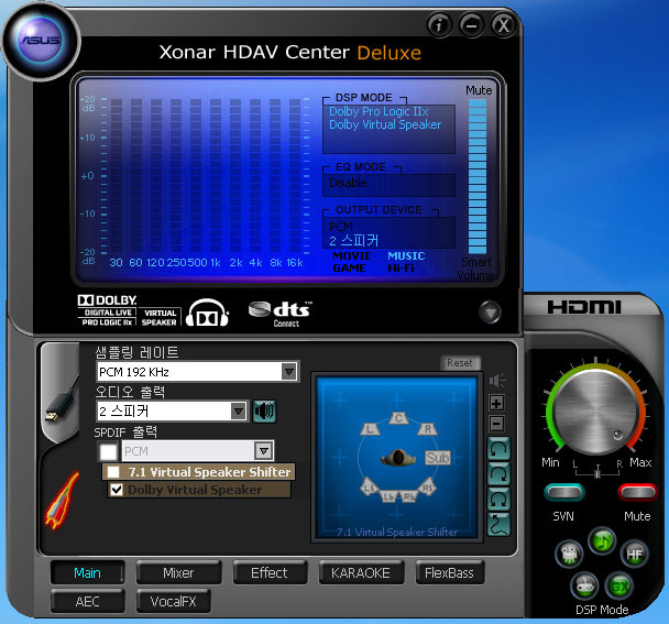 사운드 드라이브 설치는 일반적인 설치 드라이브처럼 메세지가 나오는 데로 따라서 설치해 주시면 되기 때문에, 특별히 어려움은 없습니다. 그러면 드라이브 설치가 되면, 사운드 카드를 조정하는 "XONAR HDAV Centere"라는 프로그램을 실행하면, 사운드카드를 콘트롤할 수 있는 조정 판넬이 생기게 됩니다(아래 그림 참조). "XONAR HDAV Centere" 사운드카드 조정 판넬 이 조정 판넬을 통해, 제일 먼저 해줄것은 사운드 출력을 HDMI/아날로그중 한 가지를 먼전 선택을 합니다. 그리고 연결된 리시버의 스피커의 위치나 볼륨상태를 확인할 수 있는 조정 판넬에서 확인을 해서 제대로 소리가 나는지 확인을 하시면 됩니다. 특히 아날로그 멀티채널로 사용하실 경우 설정에 많은 노력이 필요합니다.