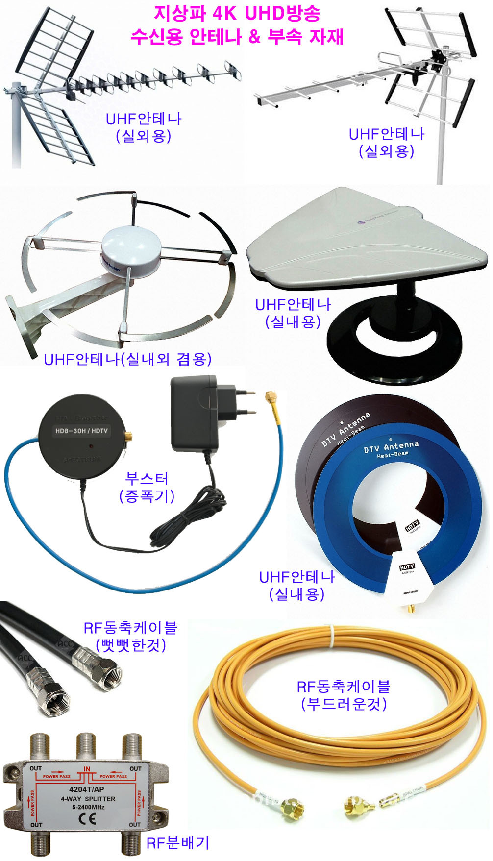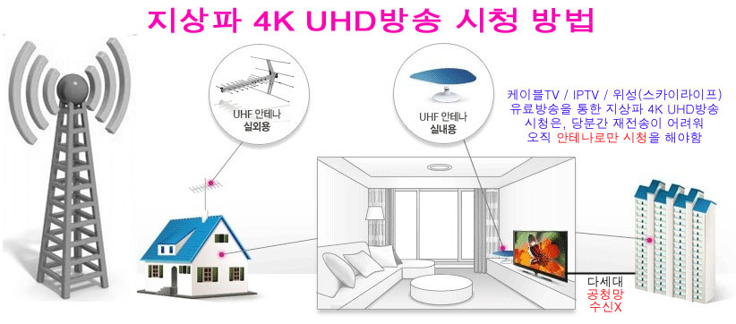 ▶지상파 4K UHD방송 전환(실시) 일정 17년 2월 KBS1/2‧MBC‧SBS 17년 9월 EBS 17년 12월 부산‧대구‧광주‧대전‧울산‧평창 동계올림픽 개최지 일원(평창‧강릉) 20년~21년 시‧군 지역(전국) 27년 지상파 HD방송 종료 ※지상파 4K UHD방송은, 현 HD방송을 4K UHD방송으로 전환하는 것임. 전환이 완료되는, 27년까지 'HD-4K UHD' 동시 방송 ※지상파 4K UHD화질 편성비율은, 초기 17년은 전체 방송시간의 5%를 권고하고, 20년까지 25%, 23년까지 50%, HD방송이 종료되는 27년에는 100% 4K UHD화질로 방송을 한다는 계획입니다. ▶지상파 4K UHD방송을 시청할 수 있는 TV 1)삼성-LG 17년 출시 4K UHDTV(ATSC 3.0수신기 내장) ATSC 3.0수신기 내장 제품이어야 온전한(부가기능 포함) 시청 가능-모두 새로 구입 2)삼성-LG 4K UHD세톱박스(ATSC 3.0수신기 내장) ※지상파 4K UHD방송을 수신(시청)하려면, 17년에 새로이 출시되는 ATSC 3.0수신기를 내장한 삼성-LG 4K UHDTV나 4K UHD세톱박스가 있어야 합니다. 17년 이전 출시한 모든 4K UHDTV는 지상파 4K UHD방송을 직접 수신하지 못합니다. 아울러 지상파 4K UHD방송 수신기(ATSC 3.0)는 당분간 삼성-LG외에는 나오기가 쉽지 않습니다. 삼성-LG TV가격의 절반도 안 되는 중소업체 TV나 중국산 TV의 경우, ATSC 3.0수신기 관련 부품과 기술이 없고, 또한 HDR관련 기술이 없어서, 2018년 안에는 저렴한 4K UHDTV(ATSC 3.0수신기 내장) 출시가 어려울 것으로 보입니다. 참고로 삼성-LG가 2017년에 출시한다는 4K 세톱박스(ATSC 3.0수신기 내장)에 대한 정확한 출시 일정과 사양이 아직 공개되지 않아, 지상파 4K UHD방송 수신기(세톱박스)에 대한 사양(기준)을 제시해 봅니다. ☞지상파 4K UHD방송 수신기(세톱박스) 1)지상파 4K UHD방송 수신기(세톱박스) 전면 기능 시간-채널 표시 기능 / 채널-볼륨-방향키 기본 내장 2)지상파 4K UHD방송 수신기(세톱박스) 후면 기능 ①지상파 4K UHD방송 수신 안테나 단자(ATSC 3.0) →케이블TV는 8VSB방식이라 사실상 지상파 4K UHD방송만 안테나로 수신 ②지상파 HD방송 수신 안테나 단자(ATSC)-케이블TV 8VSB방식(HD방송) 수신 →지상파 HD방송 수신 및 케이블TV 지상파 재전송(8VSB) 신호 수신단자 ③LAN(유선)-1Gbps→지상파 4K UHD방송 양방향데이터방송 이용 또는 폼웨어 업데이트 ④Wi-Fi-876.11ac(1Gbps) →유선LAN과 동일 기능(유선LAN 설치가 어려운 곳) ⑤USB 3.0 →외장HDD 연결(4K UHD방송 녹화) 또는 동영상(4K)/사진 재생 ⑥HDMI(HDMI 2.0a)출력-HDMI입력 단자가 있는 모든 TV+모니터 연결 →3840x2160@60p/30p, 1080p/i, 720p 설정 →HDR 10/HLG 기본 지원 ⑦광(S/PDIF) 오디오 디지털 출력 →SD급 디지털 5.1Ch오디오 출력 ⑧컴퍼지트(노랑) 출력→아날로그 비디오 출력 ⑨아날로그 오디오 출력→STEREO 오디오 출력 ⑩IR(리모컨)센서 연결단자→세톱박스를 TV뒷면에 부착해서 사용할 경우 ※리모컨은 TV와 같이 전원 On/Off가 되면서, 채널-볼륨등도 함께 동작 ※세톱박스 전원코드는 TV와 같이 분배가 될 수 있도록(1코드 2분배) ※세톱박스를 이용한 각종 부가 서비스 이용이 가능하도록(부족한 부분은 추후 업그레이드 지원) ※세톱박스 가격은 고급형 10만원 내외, 보급형은 5만원 내외 ※세톱박스 출시 시, 관련 제품에 대한 검증을 거쳐, 시판한다. ☞지상파 4K UHD방송 수신용 안테나 & 부가 장비 지상파 4K UHD방송 수신용 안테나는, 기존 UHF안테나면 대다수 수신(시청)이 가능합니다. 즉, UHF 14~69(470~806MHz)번까지 수신이 가능한 안테나면, 그대로 사용이 가능합니다. 그래서 아래와 같은 방법으로 지상파 4K UHD방송을 시청(수신)하면 됩니다. 현재 지상파 HD방송 직수율(공청망 포함)은, 2015년 방통위 기준 5.3% 정도 입니다. KBS만 기준으로는 본다면, 전국 수신커버리지가 85%이상 나오지만, 실상은 지상파 5개 채널 모두를 양호하게 수신하기는 쉽지 않은 게 작금의 현실입니다. 그런데 지상파 4K UHD방송은, 직수율이 더 떨어질 것으로 보입니다. 지상파 HD방송 직수율 시청자 중, 상당수가 공청망을 이용한 시청자인데, 다세대 가구(아파트)의 공청망이 HD방송(8VSB) 설비에 맞추어져 있다 보니, 지상파 4K UHD방송에서 사용하는 OFDM방식을 전송하지 못하기 때문입니다. 이러한 설비 교체비용만 해도 300만원 내외나 하기 때문에, 앞으로 지상파 직 수신(공청망) 문제는 상당한 개선의 노력이 없으면, 더한 직수신율 저하가 발생할 것으로 보입니다. 그렇지만, 오히려 수신율이 증가할 것이라는 전망도 있습니다. 즉, 송출 출력을 HD방송(2KW이내) 때보다 2~3배 높은 5KW이상으로 올리고, 지상파 4K UHD본방송 1채널에 대한 전송 비트레이트를 20Mbps이내로(무늬만 4K UHD화질) 방송을 한다면, 어지간한 지역에서도 실내 안테나로 지상파 4K UHD방송을 수신(시청)할 수 있을 것으로 보입니다. 이러한 실험은 직접 확인을 한 것입니다. 즉, 25Mbps이상으로 방송할 때는 실내안테나로 지상파 4K UHD실험방송을 수신하지 못하였는데, 15~18Mbps로 송출하는 지상파 4K UHD실험방송은, 실내안테나로 양호하게 수신을 하였습니다. 참고로 유료방송사들의 지상파 4K UHD방송 재전송은, 2017년 안에는 쉽지 않을 전망입니다. 그동안 지상파 HD방송은, 본방송 1채널만 전송을 하면 되었지만, 지상파 4K UHD방송은, 단순 4K UHD본방송만 하는 것이 아니고, 각종 부