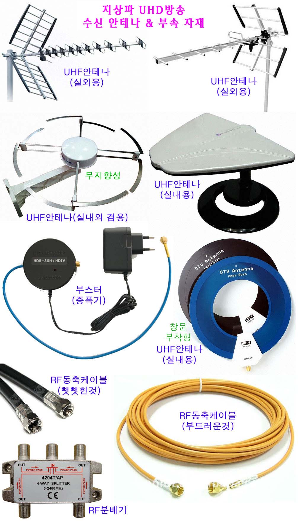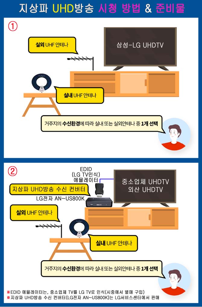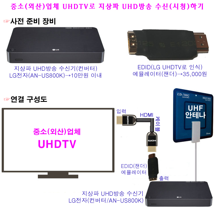 | ▶지상파 UHD(4K)방송을 시청할 수 있는 TV & 시청 방법 1)2017년 이후 출시 삼성~LG UHDTV+안테나(공청망)로 직접 수신 2)2017년 이전 출시 삼성~LG 4K UHDTV+삼성-LG가 출시한 지상파 UHD(4K)방송 수신기(컨버터)+안테나(공청망)로 직접 수신 3)외산 또는 중소업체 UHDTV ①LG전자 지상파 UHD방송 수신기(컨버터/AN~US800K) ②EDID 에뮬레이터(잰더)→LG전자 UHDTV로 인식 ③UHF안테나 또는 아파트 공청망 공청망의 경우, 지상파 UHD방송 수신이 가능한 설비로 교체 |
