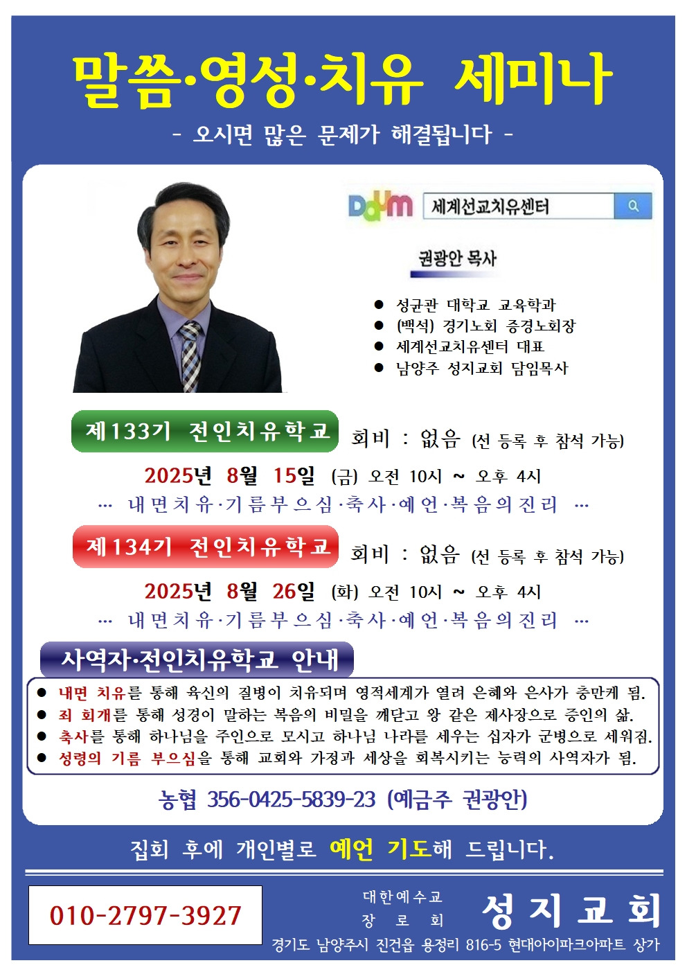 (8월) 제133기 전인치유학교 / 2025년 8월 15일 (금, 오전 10시-오후 4시) 작성자약속믿고|작성시간25.07.30|조회수23 목록 댓글 0 글자크기 작게가 글자크기 크게가 다음검색 현재 게시글 추가 기능 열기 북마크 공유하기 신고 센터로 신고 댓글 댓글 0 댓글쓰기 답글쓰기 댓글 리스트