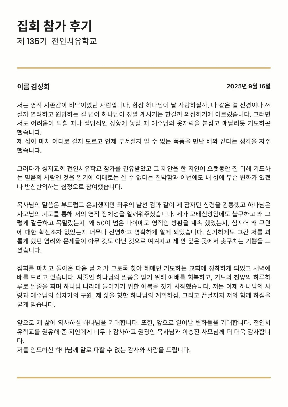 (제135기) 자존감 회복과 함께 다시 시작된 새로운 삶의 변화 작성자약속믿고|작성시간25.09.19|조회수32 목록 댓글 1 글자크기 작게가 글자크기 크게가 다음검색 현재 게시글 추가 기능 열기 북마크 공유하기 신고 센터로 신고 댓글 댓글 1 댓글쓰기 답글쓰기 댓글 리스트 작성자약속믿고 작성자 본인 여부 작성자 | 작성시간 25.09.19 시작된 하나님의 은혜가 풍성한 믿음의 결실로 맺혀지기를 기원합니다 🙏 ~ 댓글 전체보기
