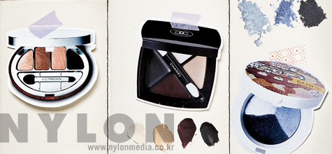 컬러 쿼텟 포 아이즈 “클라란스에서는 2009 F/W 시즌에 인위적이고 강렬한 색상을 사용하기보다는 자연 속에서 영감을 받아 피부 본연의 건강함을 강조하려고 해요. 들판의 바람에 흔들리는 밀과 자연의 곡식에서 올가을 유행 코드인 누드 컬러를 만들어냈죠. 그중 컬러 쿼텟 포 아이즈는 누드계열의 베이지, 모카, 하이라이트 초콜릿 누드 컬러 등으로 구성된 팔레트예요. 같은 계열 컬러로 구성돼 세밀하게 그러데이션하지 않고 뭉개듯 발라도 자연스러워 보이는, 그래서 사용하기 쉬운 제품이에요. 이 뉴트럴 룩의 아이 메이크업에는 핑크 계열보다는 베이지가 많이 들어 있는 입술 색상이 안정감을 줄 거예요.”