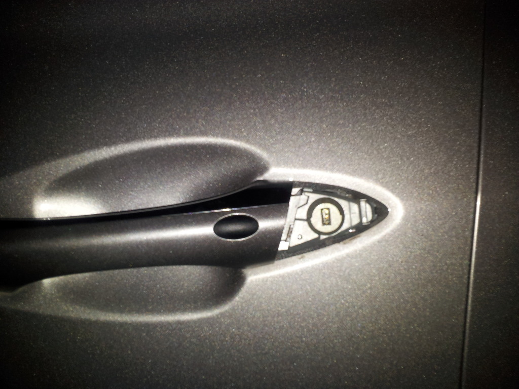 손잡이 옆을 제거 하고 열쇠구멍을 노출시킨 모습