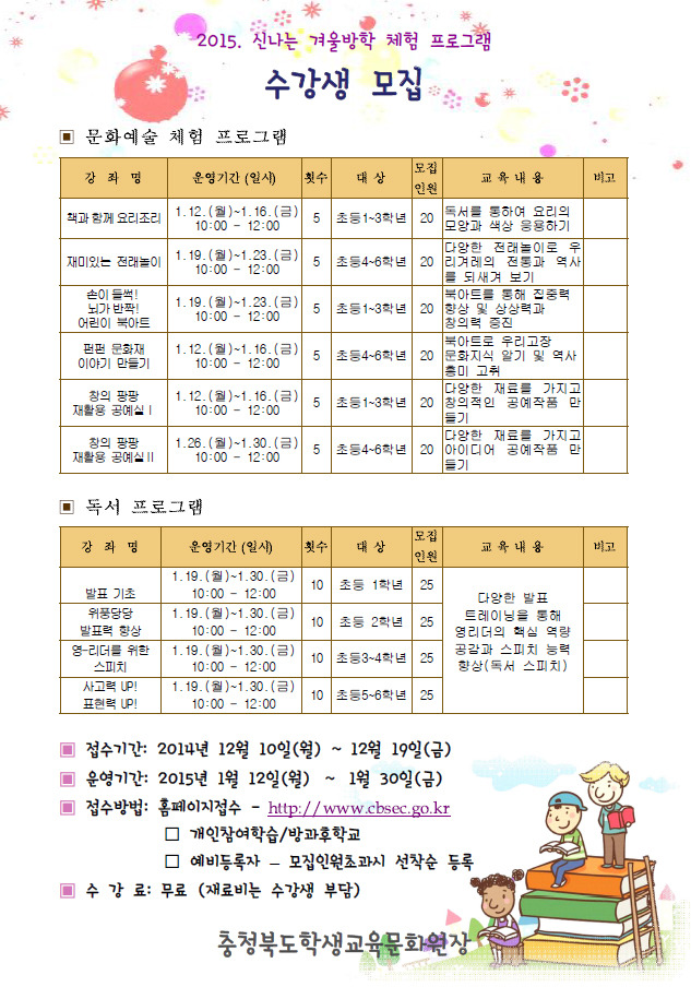 충청북도학생교육문화원 겨울방학 프로그램 안내입니다. 작성자책나와라 뚝딱(윤원모)|작성시간14.12.08|조회수38 목록 댓글 1 글자크기 작게가 글자크기 크게가 접수: http://www.cbsec.go.kr 학생교육.jpg 첨부파일첨부된 파일이 2개 있습니다. jpg 파일 학생교육.jpg 다운로드 jpg 파일 학생교육.jpg 다운로드 다음검색 현재 게시글 추가 기능 열기 북마크 공유하기 신고 센터로 신고 댓글 댓글 1 댓글쓰기 답글쓰기 댓글 리스트 작성자미모마미 | 작성시간 14.12.08 학생문화원에서 만나요 ~ 댓글 전체보기