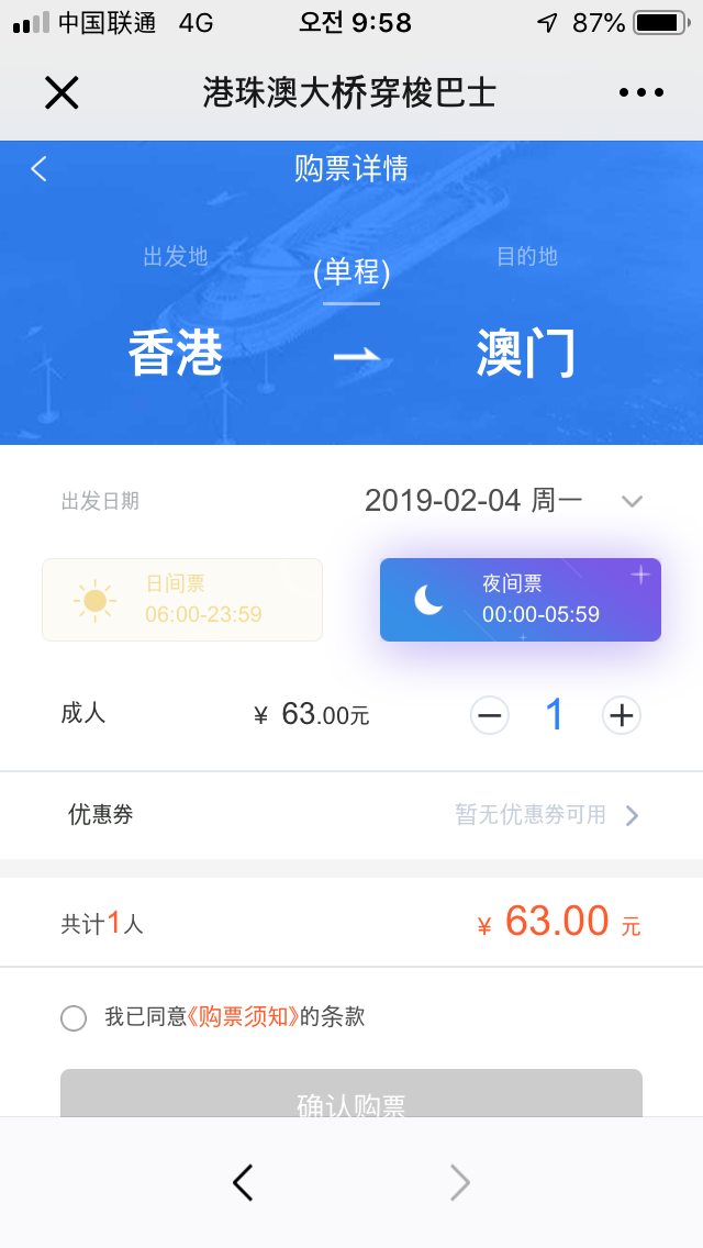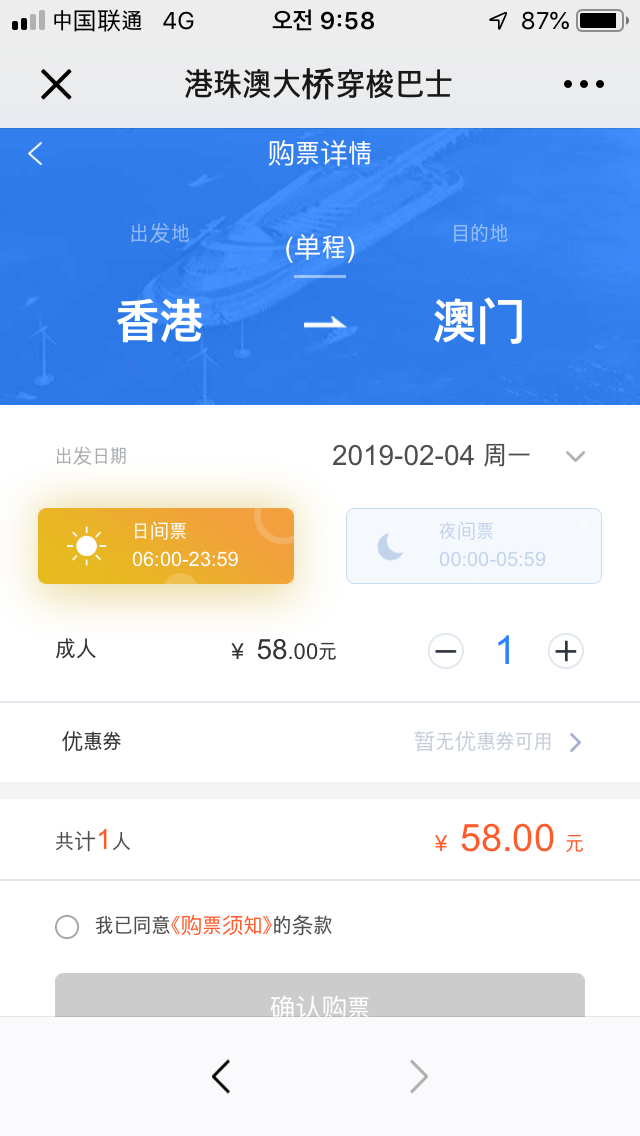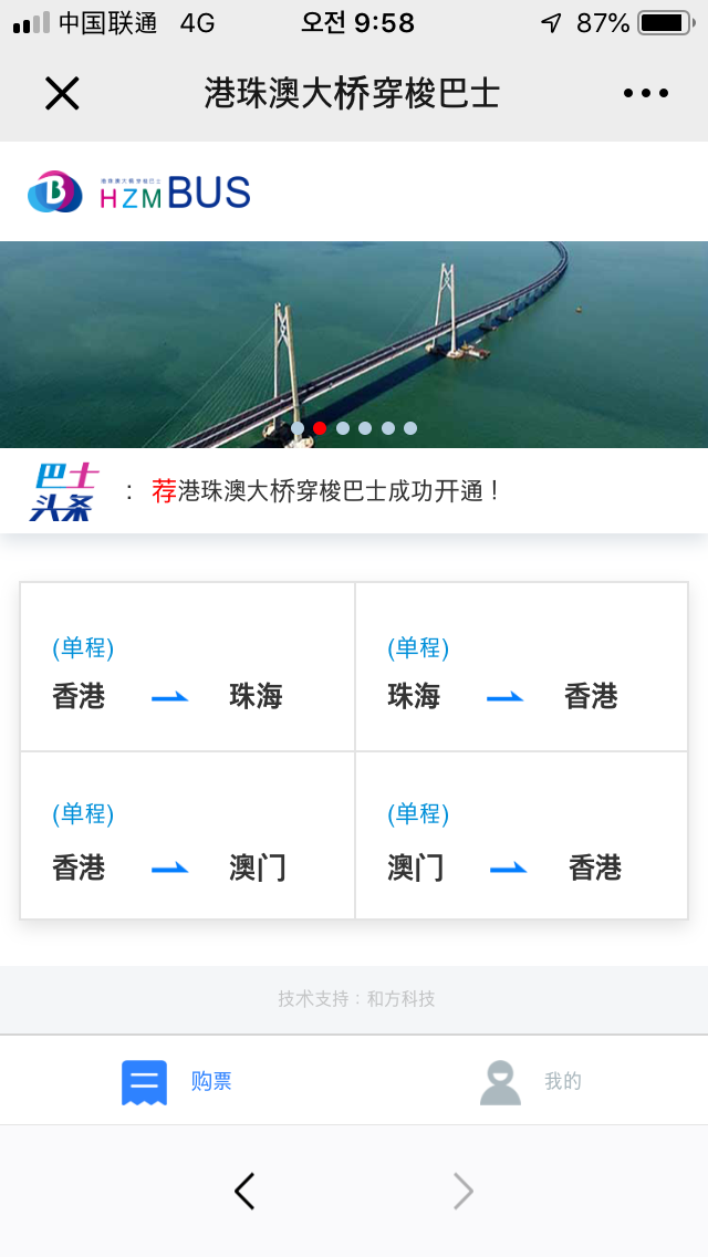홍콩<-> 주하이의 버스 티켓 예매및 구매를 \