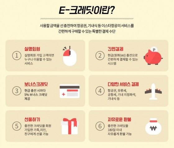 실명회원 가입 후 현금 충전을 통해 한번의 클릭으로 간편 결제 항공권 구매가 가능하며, 현금 충전 시 마다 5% 추가 보너스를 제공한다. 이스타항공 관계자는 "홈페이지 개편을 통해 기존 LCC(저비용항공사)들이 운영하고 있는 마일리지나 포인트제도와는 차별화된 E-크레딧 서비스를 열었다"고 했다.