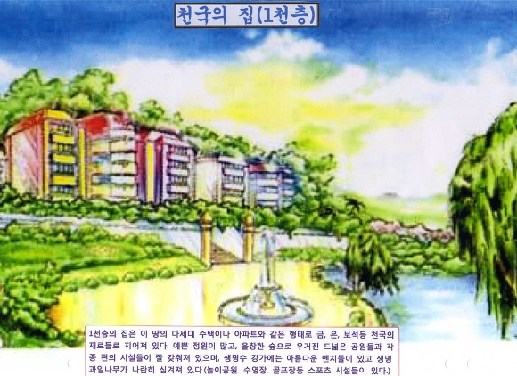 또한 헤아릴수 없이 많은 천사들이 있어, 주인의 수종을 들고 각종 건축물이나 시설들을 관리하며, 구름자가용을 호위하고 무용이나 악기로 하나님을 찬양하면서 최고의 행복과 평안함을 누릴 수 있도록 준비되어 있습니다. )