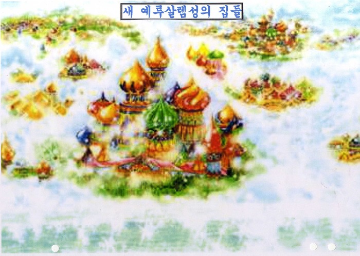 아 름다운 보석들로 지어진 집들이 발하는 다양한 빛과 하나님의 영광의 빛, 그리고 맑고 투명하면서도 푸른빛이 감도는, 벽옥과 정금으로 된 정육면체 모양의 성 전체에서 나는 빛들이 어우러져, 새 예루살렘 성이 마치 살아 움직이는 것처럼 보입니다.