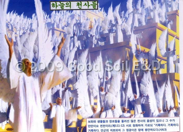 하늘의 천사들은 모든 악기를 동원하여, 하나님께 찬양하며 영광돌립니다.