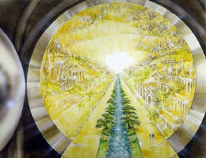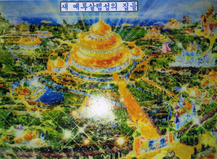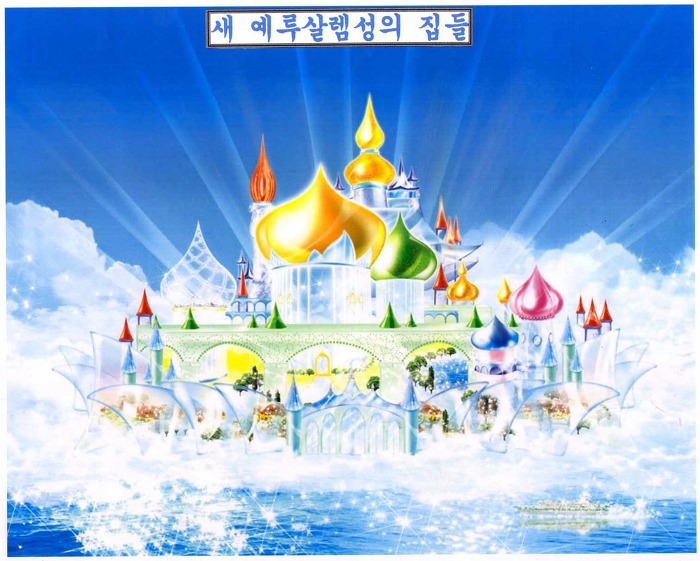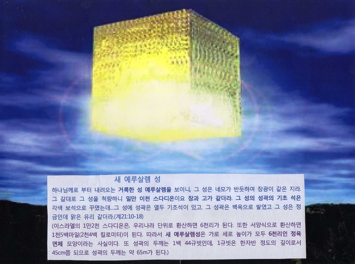 “하 나님께로부터 하늘에서 내려오는 거룩한 성 예루살렘성을 보이니, 하나님의 영광이 있으매 그 성의 빛이 지극히 귀한 보석 같고, 벽옥과 수정같이 맑더라. 그 성은 네모가 반듯하여 장광이 같은지라. 그 갈대로 그 성을 척량하니 일만 이천 스타디온이요 장과 광과 고가 같더라. 크고 높은 성곽이 있고 열두 문이 있는데...그 열두 문은 열두 진주니 문마다 한 진주요. 성의 길은 맑은 유리 같은 정금이더라.”(계21:10-21)