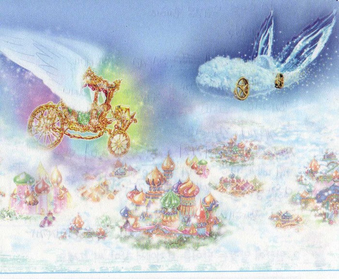 '구름 자가용'- 눈부실 만큼 새하얀 구름에 오색찬란한 빛으로 둘려 있는데, 네 개의 바퀴와 날개가 달려 있지요. 길에서는 바퀴로 달리다가 하늘을 날 때는 자연스럽게 바퀴가 나와, 하늘과 땅을 자유롭게 오 갈수 있도록 되어있습니다.