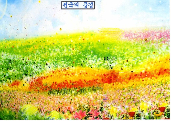 천사들의 안내에 따라 정금 길을 걷노라면, 길 좌우에 크고 탐스러운 형형색갈의 꽃들이 향기를 발하며, 그 너머로는 끝없이 펼쳐진 금잔디와 각종 나무들이 어우러져 아름다운 조경을 이루고 있습니다.)
