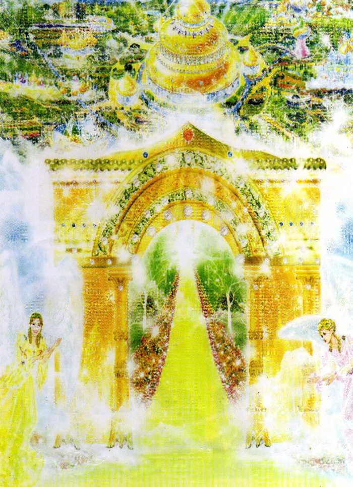 정 금과 벽옥으로 만들어져 푸른빛이 감도는 맑고 투명한 황금빛이 아름답고 찬란하게 빛나지요. 성벽에서는 황홀하고 아름다운 향이 나며, 그 주위에 쭉 둘러져 있는 꽃에서도 온갖 향이 뿜어 나와 말할수 없는 행복과 기쁨을 안겨줍니다. 이처람 크고 작은 꽃들이 장관을 이루고 있는데, 그 종류나 모양 뿐 아니라 각각의 독특한 향들이 절묘하게 어우러져 더욱 황홀하지요 )