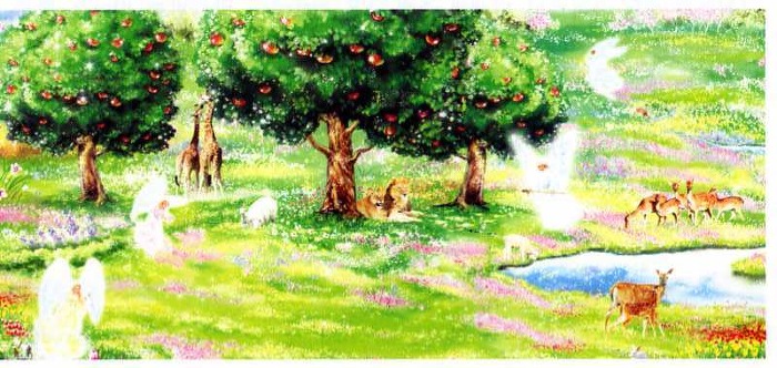나 무들은 반짝반짝 윤기나는 가지와 잎 사이로 각종 탐스러운 열매들로 가득 맺혀있고, 황금색의 깃털이 달린 각종 새들이 나무위에 앉아, 아름다운 소리로 지저귀는 모습은 평화롭고 행복해 보이기만 합니다. 그리고 간간히 동물들이 한가로이 노니는 모습도 볼수 있습니다.)
