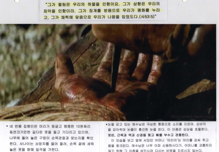 ‘마리아 발토르다’의 간증-‘마 리아 발토르다’는 1897년 이태리 ‘가제르타’에서 출생하여 37세부터 죽기까지 27년간 침대에서 생활했다. 그가 묵상 중에 받은 고난에 대한 환상중 일부를 소개한다. 네 번째 집행인은 머리가 둥굴고 팽팽한 10원짜리 동전크기만한 길다란 못을 들고 기다리고 있으며, 나무에 뚫어 놓은 구멍이 손목관절과 맞는지를 확인한다. 사나이는 쇠망치를 들어 올려, 손목 끝에 세워놓은 못을 향해 일격을 가한다.