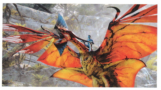 예수로 보이는 사람이 꼬리 달린 나비족 여인과 함께 "붉은 용<<" 토루크 막토를 타고 있는 모습니다.