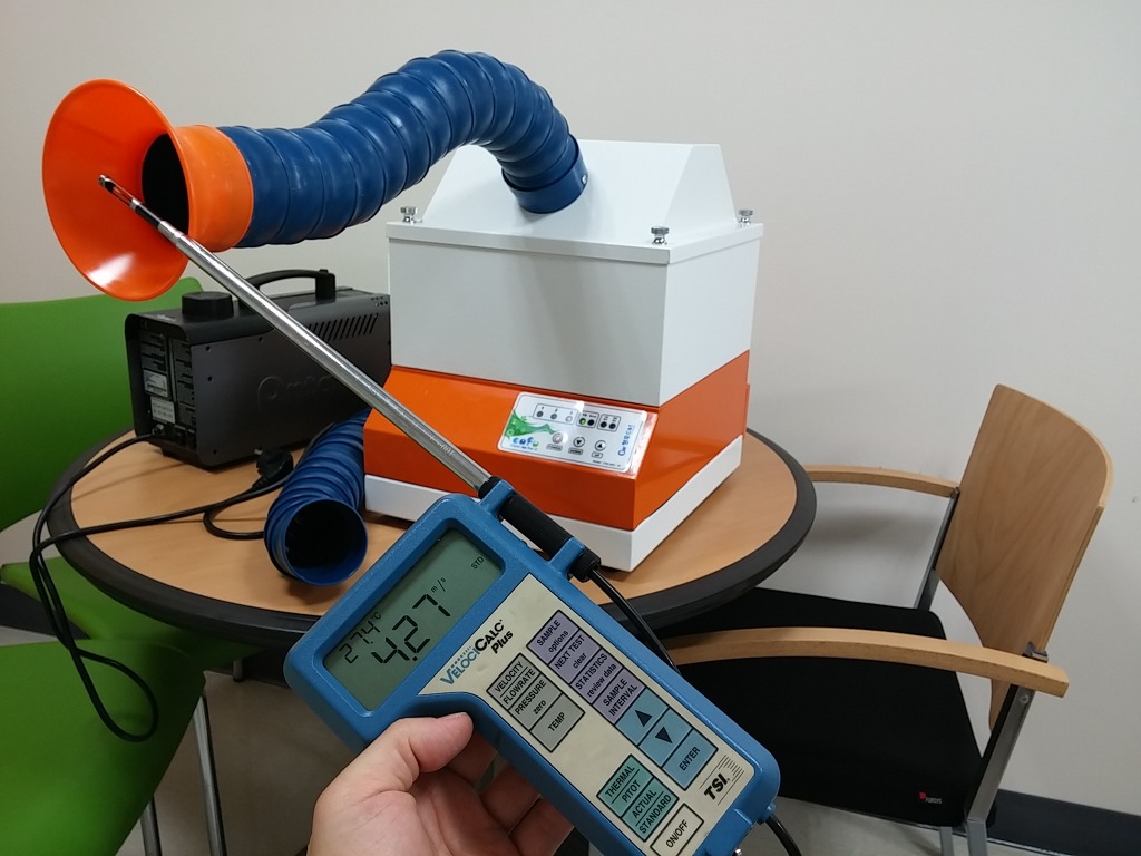 아래는 공기의 흐름을 눈으로 보기 위하여 안산병원 방재실의 최첨단 특수효과장치인 연무기를 빌려 실험해 보았습니다.