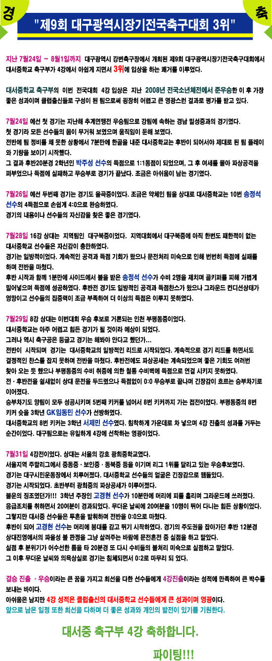 대서중, 제9회 대구광역시장기전국축구대회 3위 작성자운영자|작성시간10.09.11|조회수162 목록 댓글 0 글자크기 작게가 글자크기 크게가 다음검색 현재 게시글 추가 기능 열기 북마크 공유하기 신고 센터로 신고 댓글 댓글 0 댓글쓰기 답글쓰기 댓글 리스트