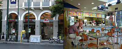 [위의 사진] 우리나라 롯데리아와 비슷한 패스트푸드점. 햄버거 뿐만 아니라 그리스식 메뉴도 많아요~