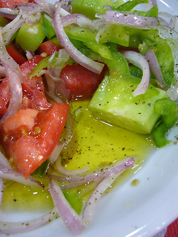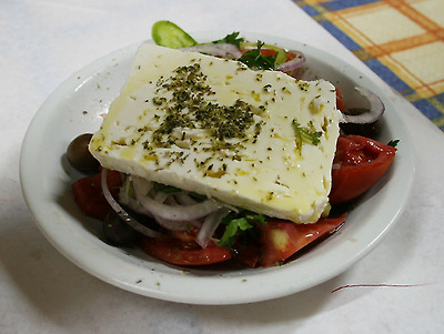 신선한 토마토, 파프리카, 올리스, 양파에 두툼하게 썰은 염소젓(또는 양젓)으로 만든 치즈를 앉고