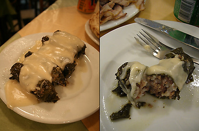 전채음식으로 다진 고기에 쌀과 양념을 해 버무린 다음, 포도잎으로 싼 음식. 너무 짜요! =_=
