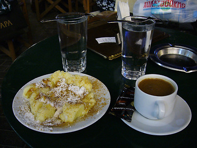 [위의 사진] 그리스식 커피(커피가루와 함께 끓여 가라앉혀 내는 방식. 그래서 끝까지 마시면 안돼요~)와
