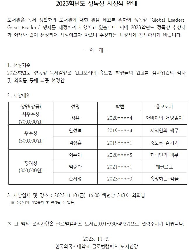 한국외대 글로벌캠퍼스 중앙도서관에서 주최한 2023학년도 정독상 대회에서