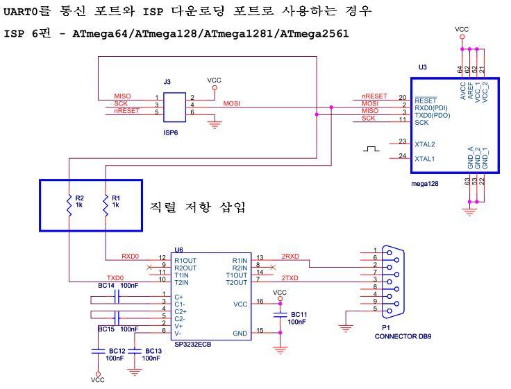 ATmeag64 / ATmega128 / ATmega1281 / ATmega2561 MCU는 다른 AVR MCU와 다르게 프로그램 다운로딩(writing)하는 포트로 RXD0/TXD0 를 사용하고 있습니다. 이러한 이유로 통신 포트와 ISP 포트를 동시에 사용하는 분들 사이에서 ISP 프로그램 다운로딩(writing) 되지 않는다는 문제를 제기하시는 분들이 많은데, 첨부한 그림처럼 회로를 구성해 보세요.