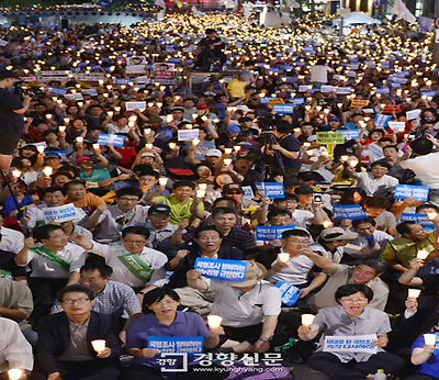 촛불은 억지로 못 꺼. 대통령이 꺼라. 청계광장 맨바닥에 앉아서 구호를 외치는 자신을 돌아보며 분노와 함께 눈물이 앞섰다. 3만5천이라고도 하고 4만이라고도 한다. 숫자는 지금 의미가 없다. 옆에 앉아 있는 나이든 노인들도 같은 심정이다. ‘어버이 연합’에나 어울린다는 오해를 받을 분들이 ‘원판김세. 박사남해’ 구호판을 들고 땀을 흘린다. 6.10항쟁에 나섰던 어른들이다. 이한열 열사의 어머님도 구호판을 드셨다. 지팡이에 겨우 의지하는 할아버지도 계시다. 초딩도 있고 중딩 고딩도 있다. 새누리당 눈에는 보이지 않는가. 대통령 눈에는 이것이 안 보이는가.