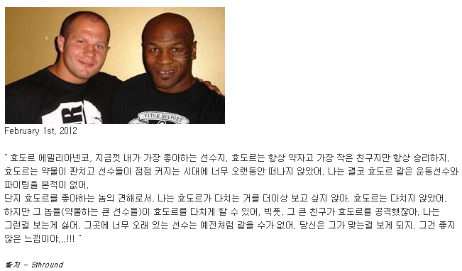 경기후에도 효도르가 콜먼에게 계속 쏘리를 연발하며 미안하다고 사과했고..콜먼은 이렇게 착하고 순수한사람이 있을줄몰랐다며