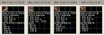 테베 오시리스의 양손검은 STR +1과 CON +2, 공격 성공 +5의 옵션으로 최대 HP와 STR, 최대 소지 무게 한계량에서 이득을 볼 수 있으며 테베 오시리스의 이도류는 DEX +2, WIS +2, 추가 타격 +1로 원거리 회피 능력과 공격 성공, MR 증가의 이득을 볼 수 있습니다. 또한 테베 오시리스의 지팡이는 STR +2, 주술력 +2, 추가 타격 +3의 효과를 누릴 수 있어 마법과 타격치 양쪽의 이득을 모두 한번에 거머쥘 수 있는 아이템입니다. 테베 오시리스의 활은 WIS +1, INT +2, 추가 타격 +1로 MR 증가, 힐 마법 회복량 증가까지 가능하니 요정/환술사에게 더욱 좋습니다.