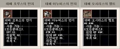 용기사에게는 스턴 내성, STR+1, 최대 HP+15의 옵션이 붙어 있는 테베 아누비스의 반지가 매우 유용하게 사용될 것 같습니다.